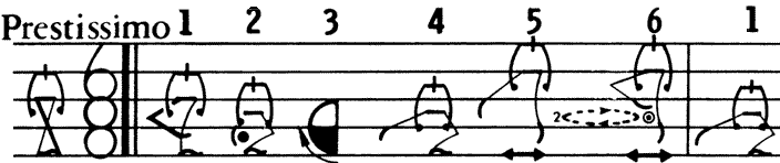 Counts coordinating with the written music are placed above the staff and the dance is divided into dance measures.